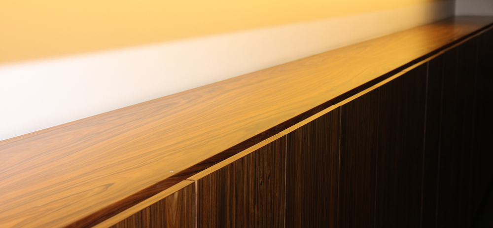 Zwevend kastengeheel in notelaar met lichtgroef en greep profiel onder de vorm van een continue rond omgaande voegontduiking.
