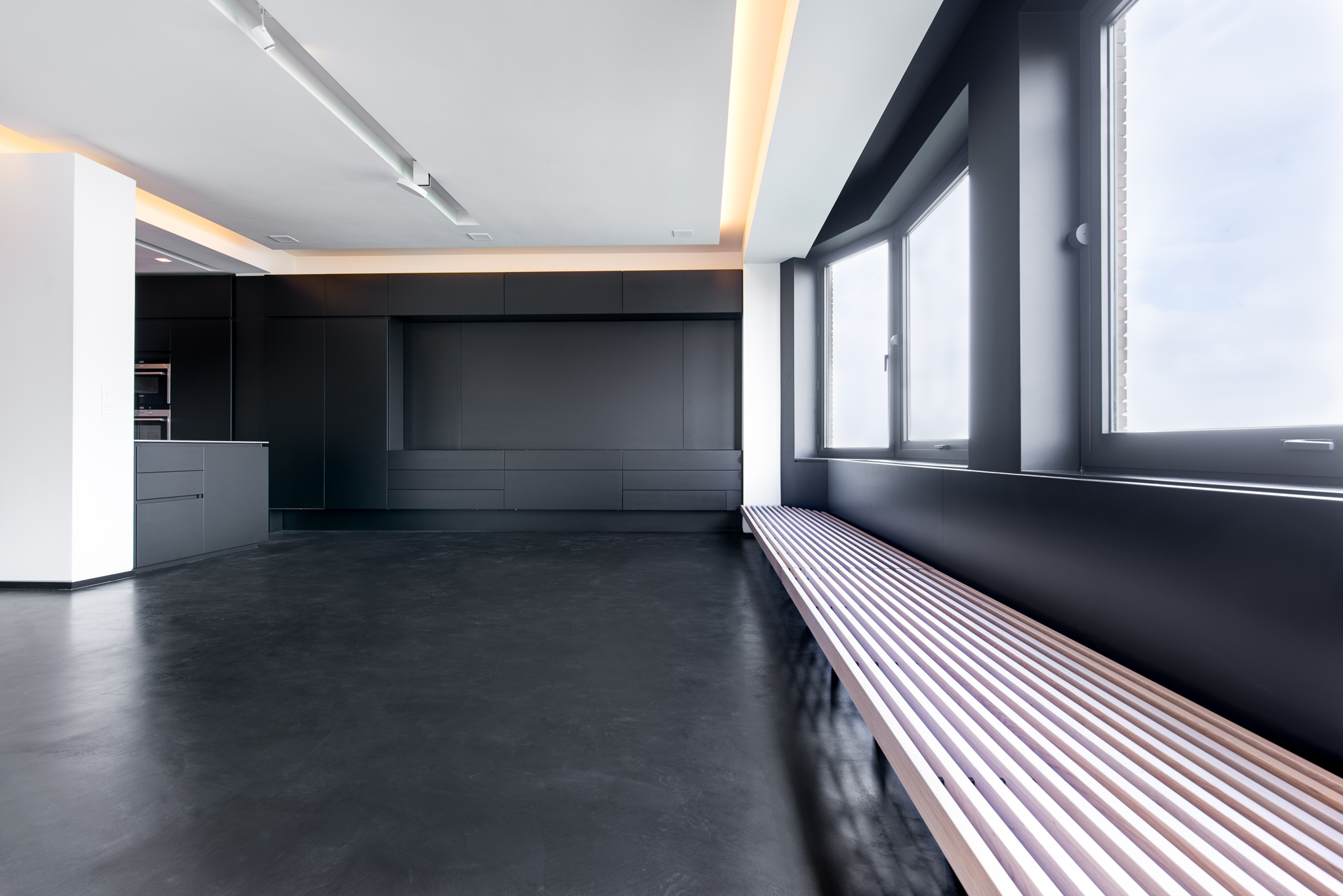 Hard zwart, de schoonheid van het uitzicht op een groot deel van Brussel haalde de overhand op de details van het meubilair. De kleine toetsen eik en wit accentueren pas echt elk detail.