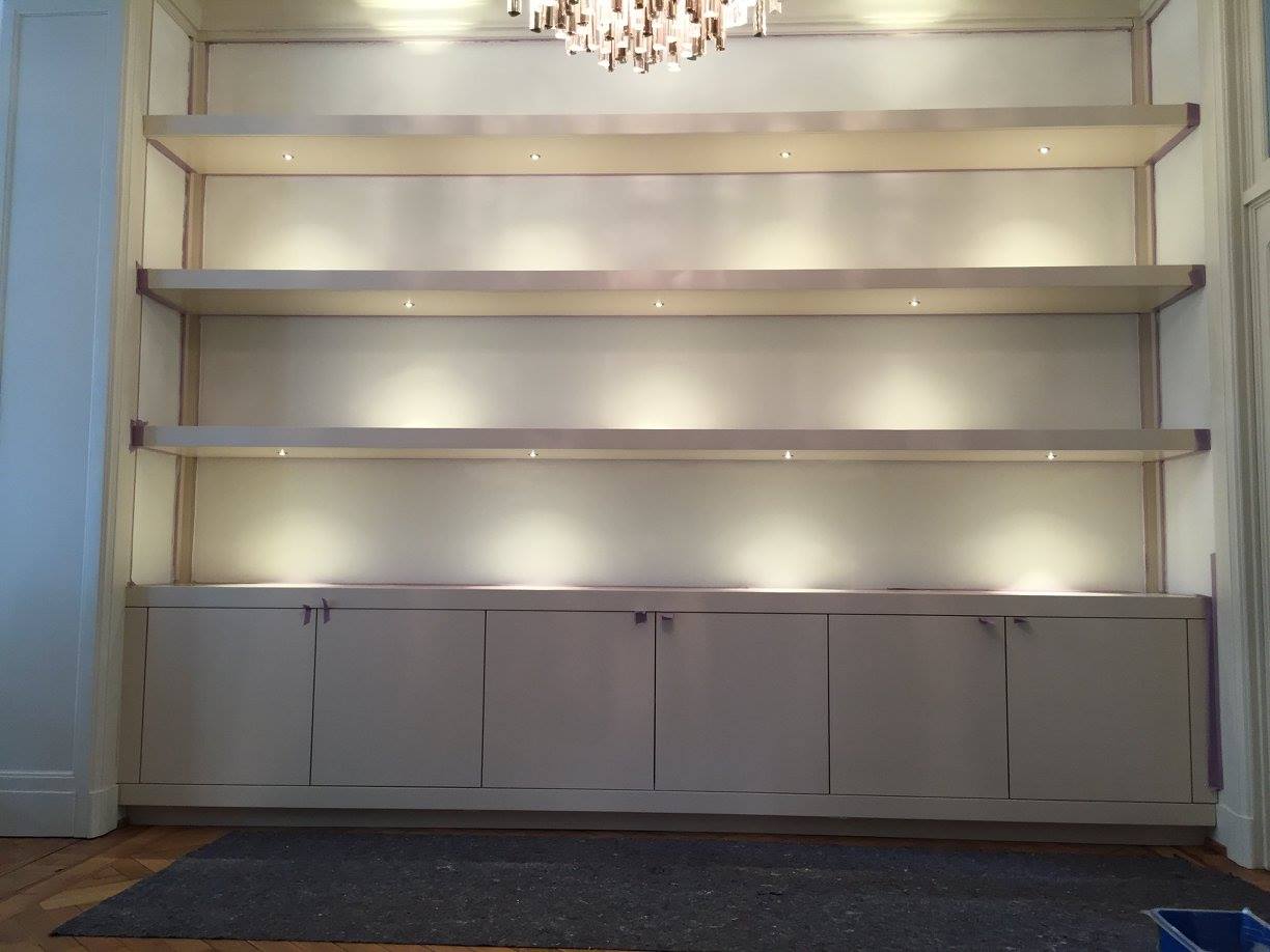 Lichtgevend berg- en bibliotheekmeubel in een robuuste zwaar klassieke Brusselse meesterwoning.