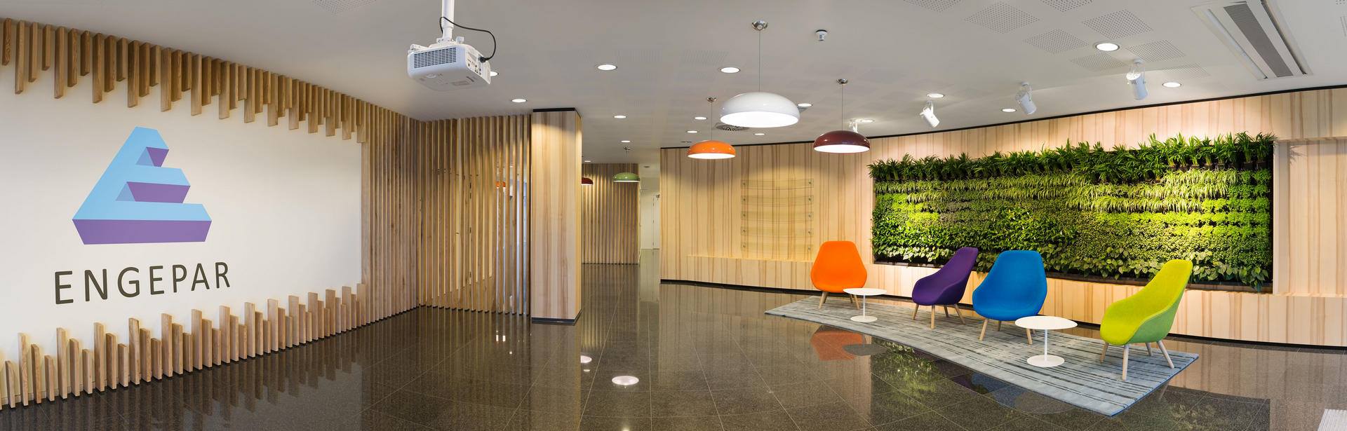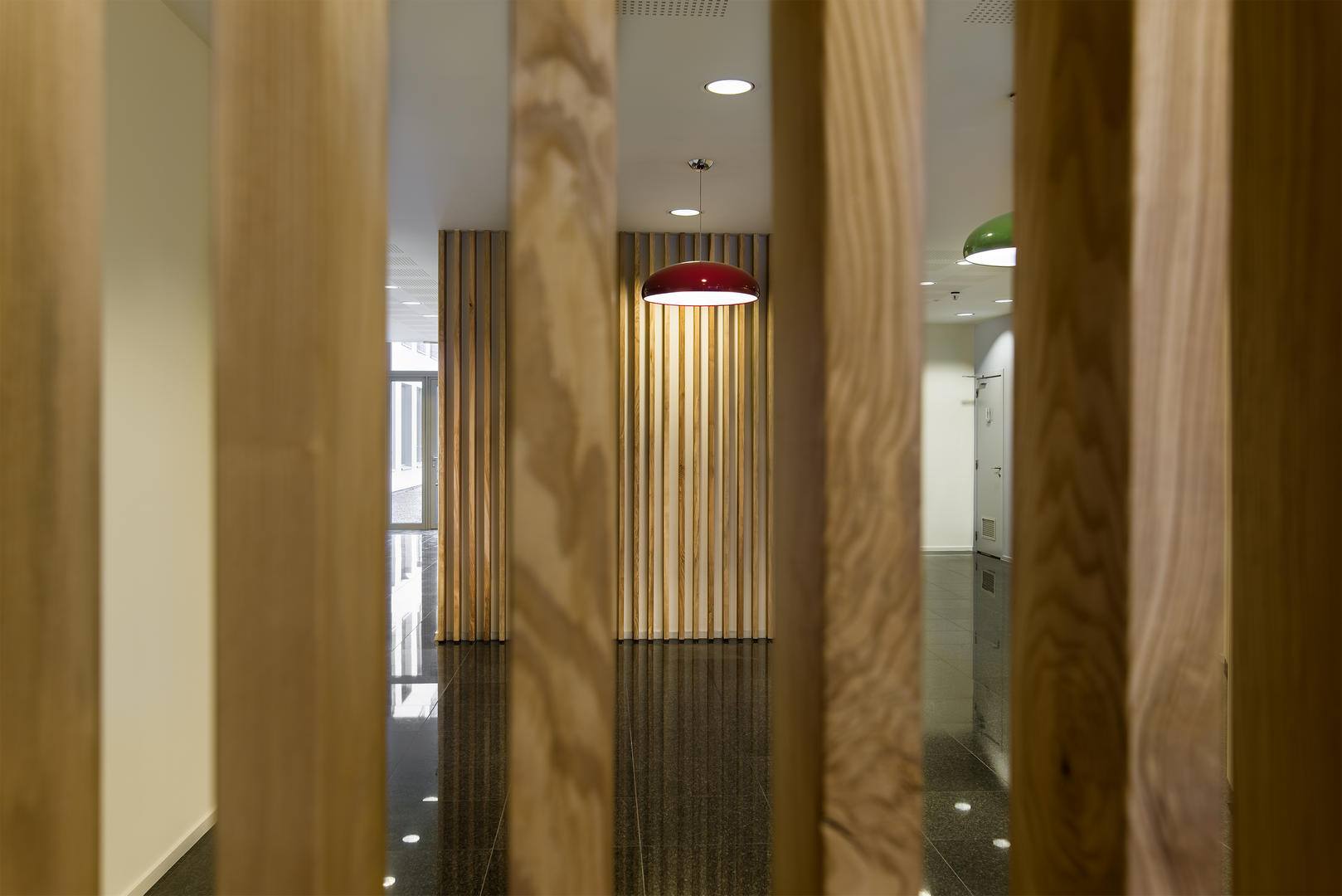 Accueil et bureau de vente Projet Engepar Hermes Plaza Hall d'entrée en olivier massif et plaqué du Pajottenland et application d'un mur de mousse.