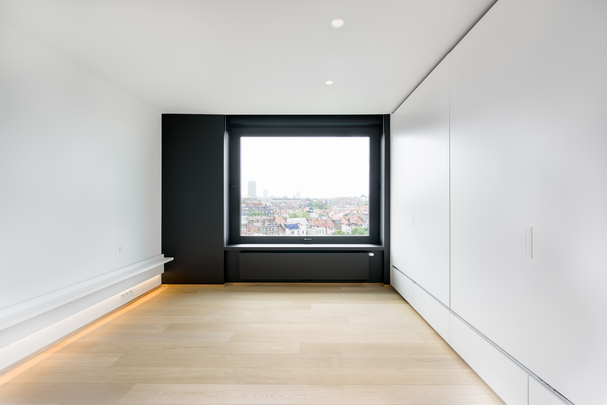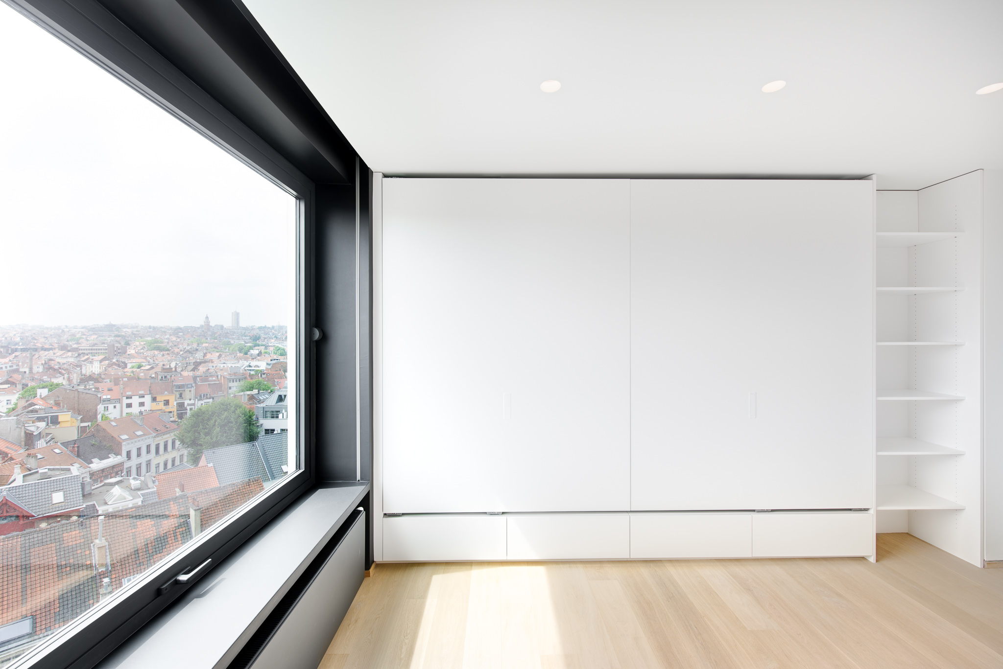 Aménagement total d'une chambre à coucher et d'un dressing. Armoire coulissante avec des portes dans le même plan comprenant des tiroirs visibles, également dans le même plan.