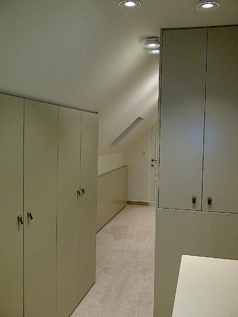 Chaque centimètre carré compte. Des armoires de coin sous le toit, des armoires dans les niches entre les chevrons, ... aucun défi n'est trop grand pour nous. Unité magnifique en teinte laquée verte.