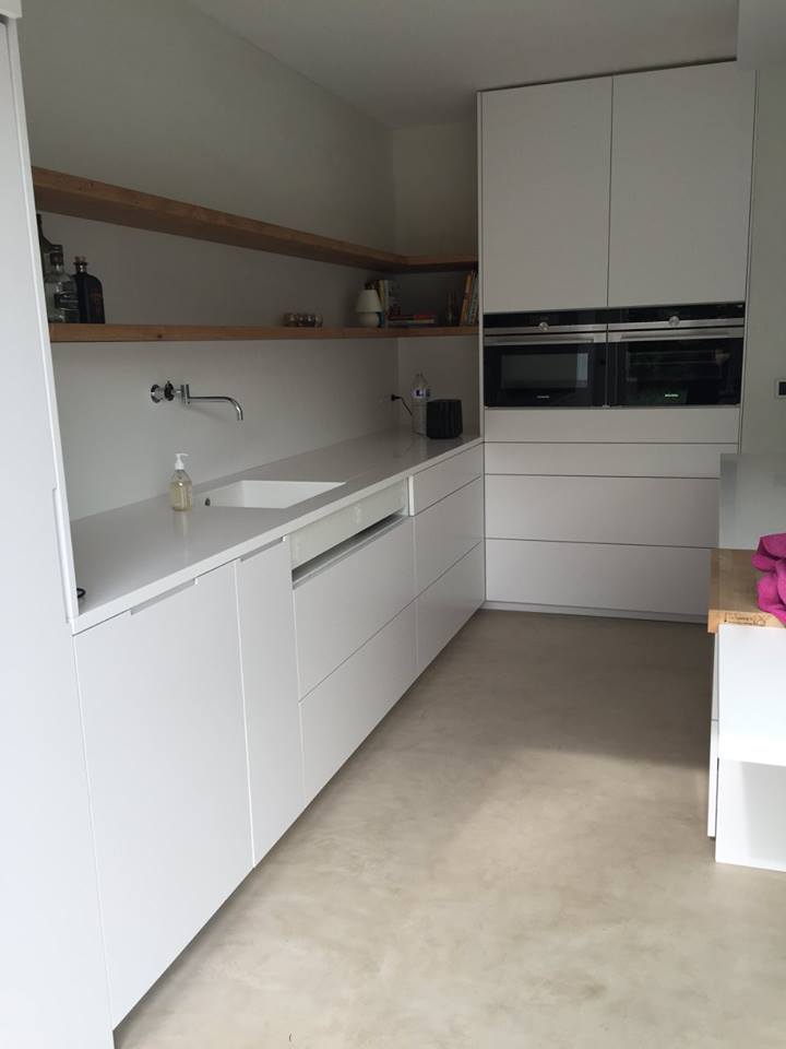 Cuisine blanche et élégante avec façades laquées et plan de travail et d'éclaboussures en solid surface. Plinthes dissimulées. Poignées de bols sobres intégrées.