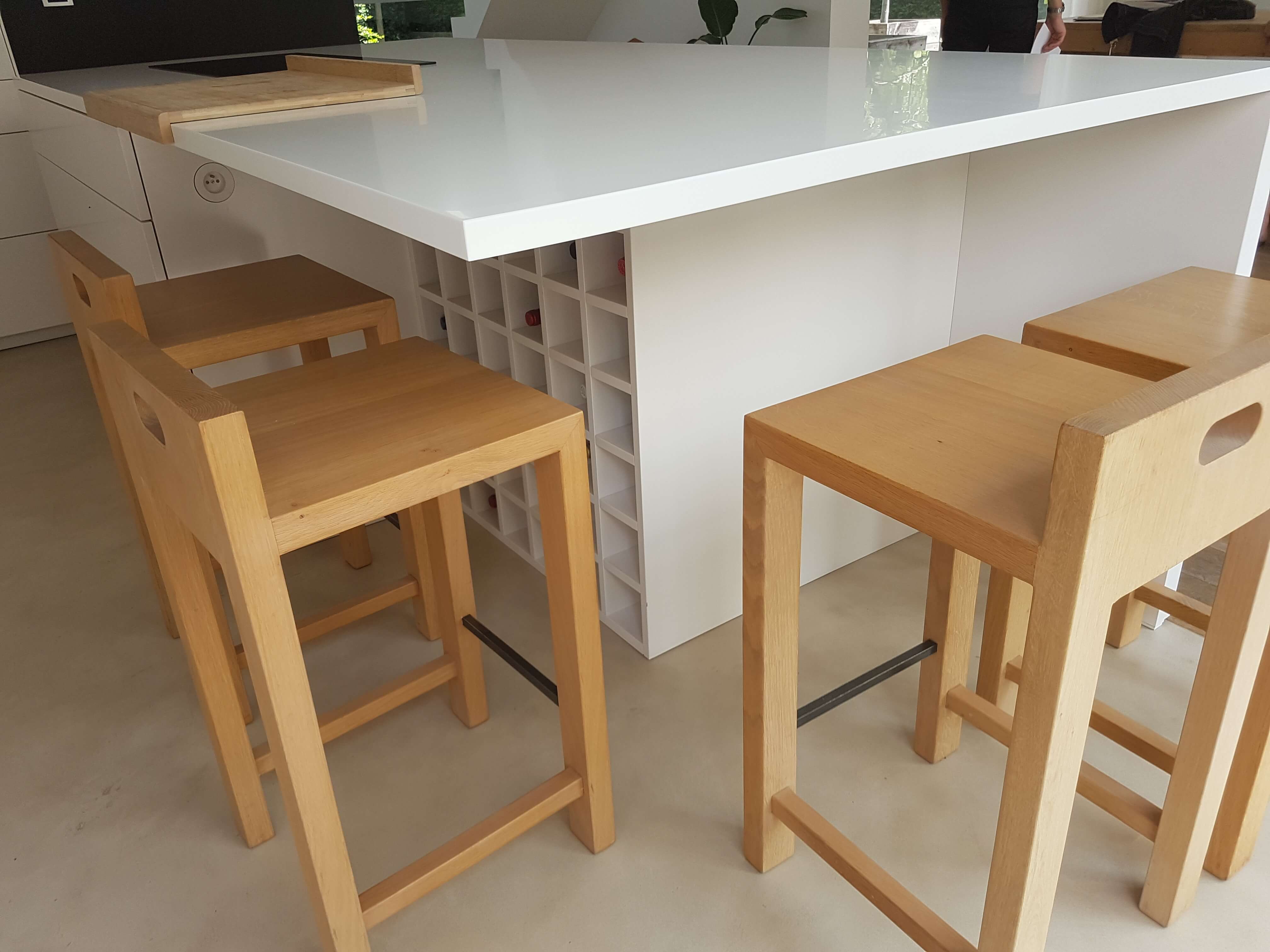 Accents dans la totalité de la cuisine. Chaises en chêne et niche de vin.