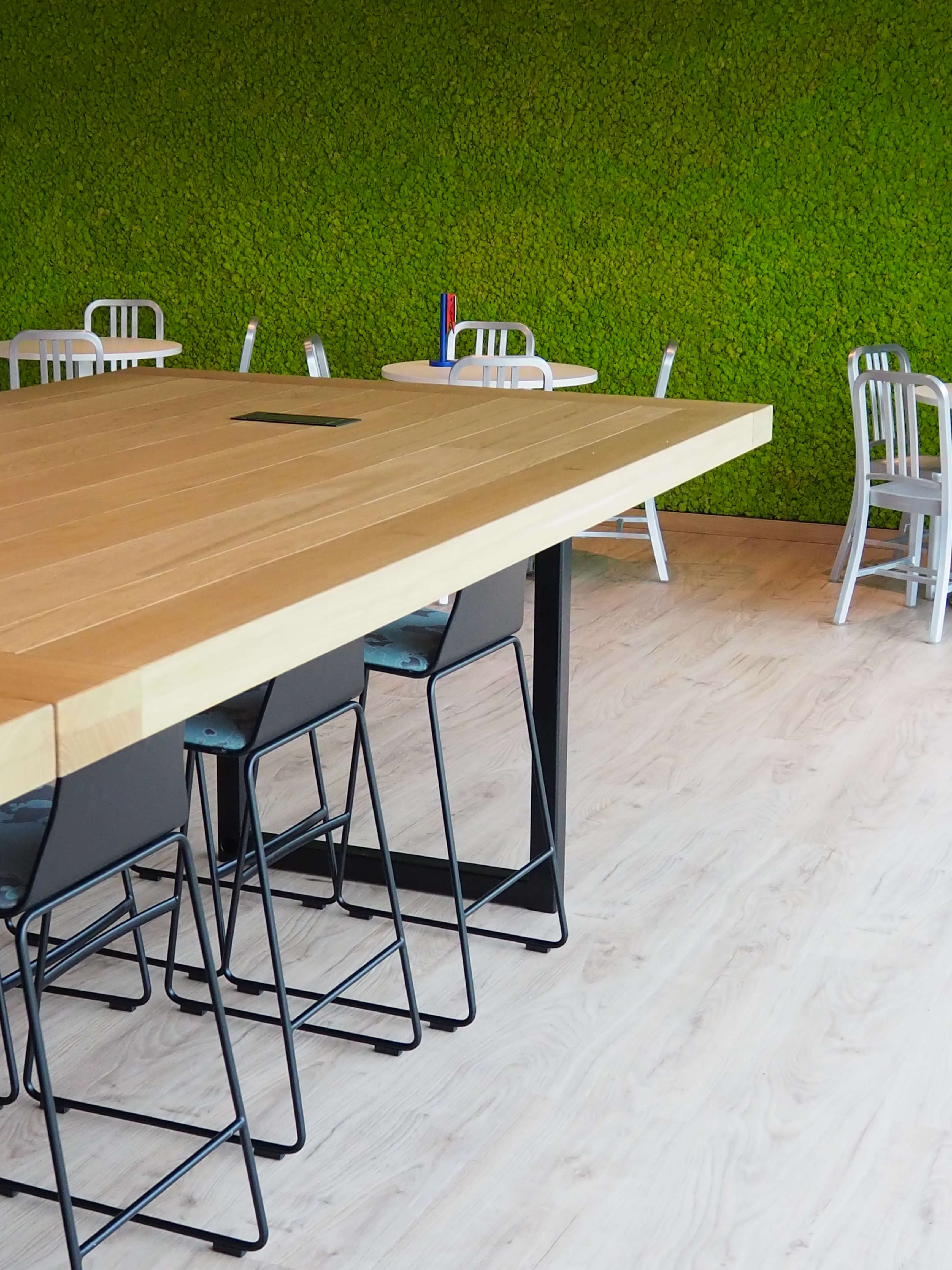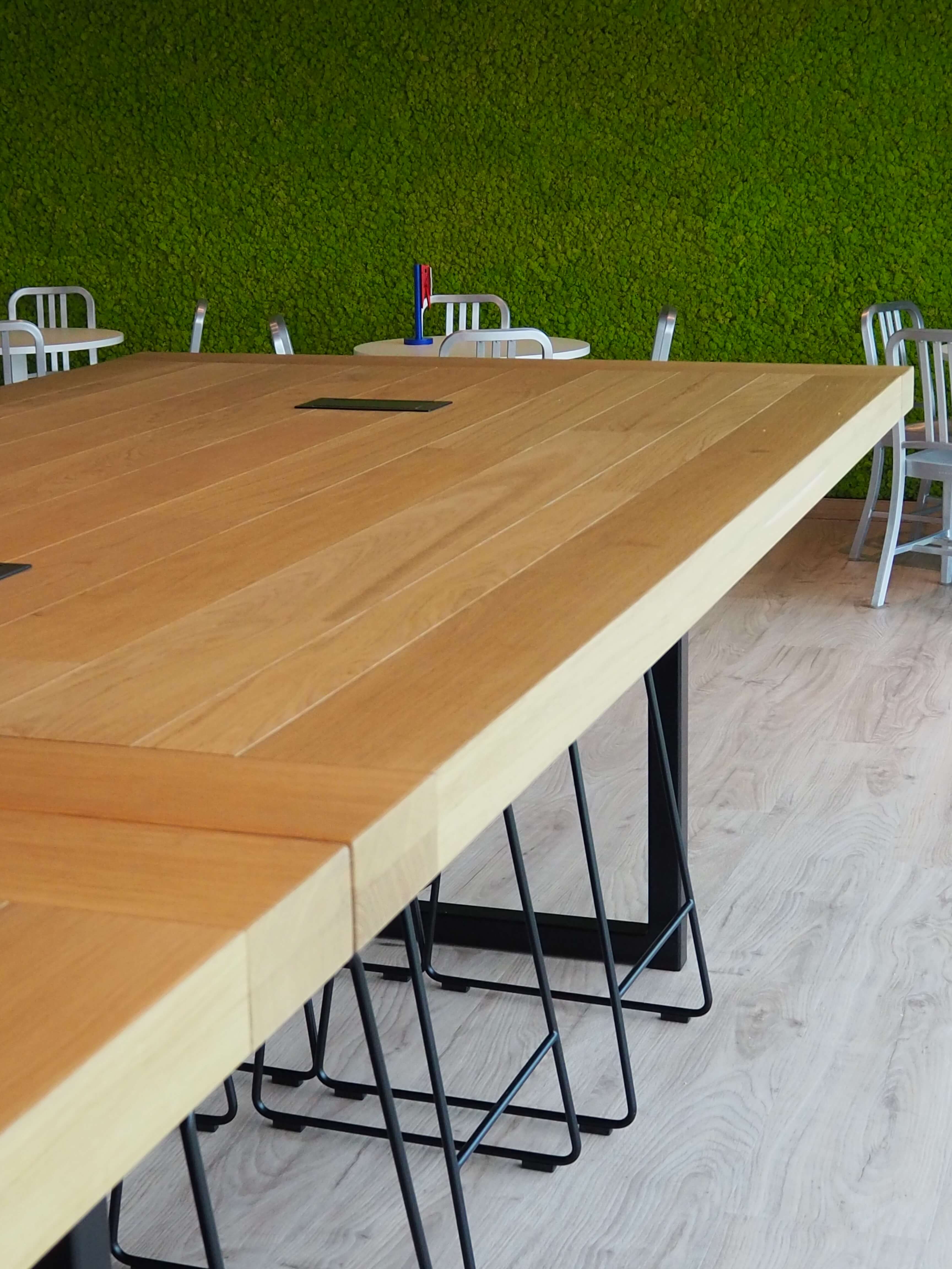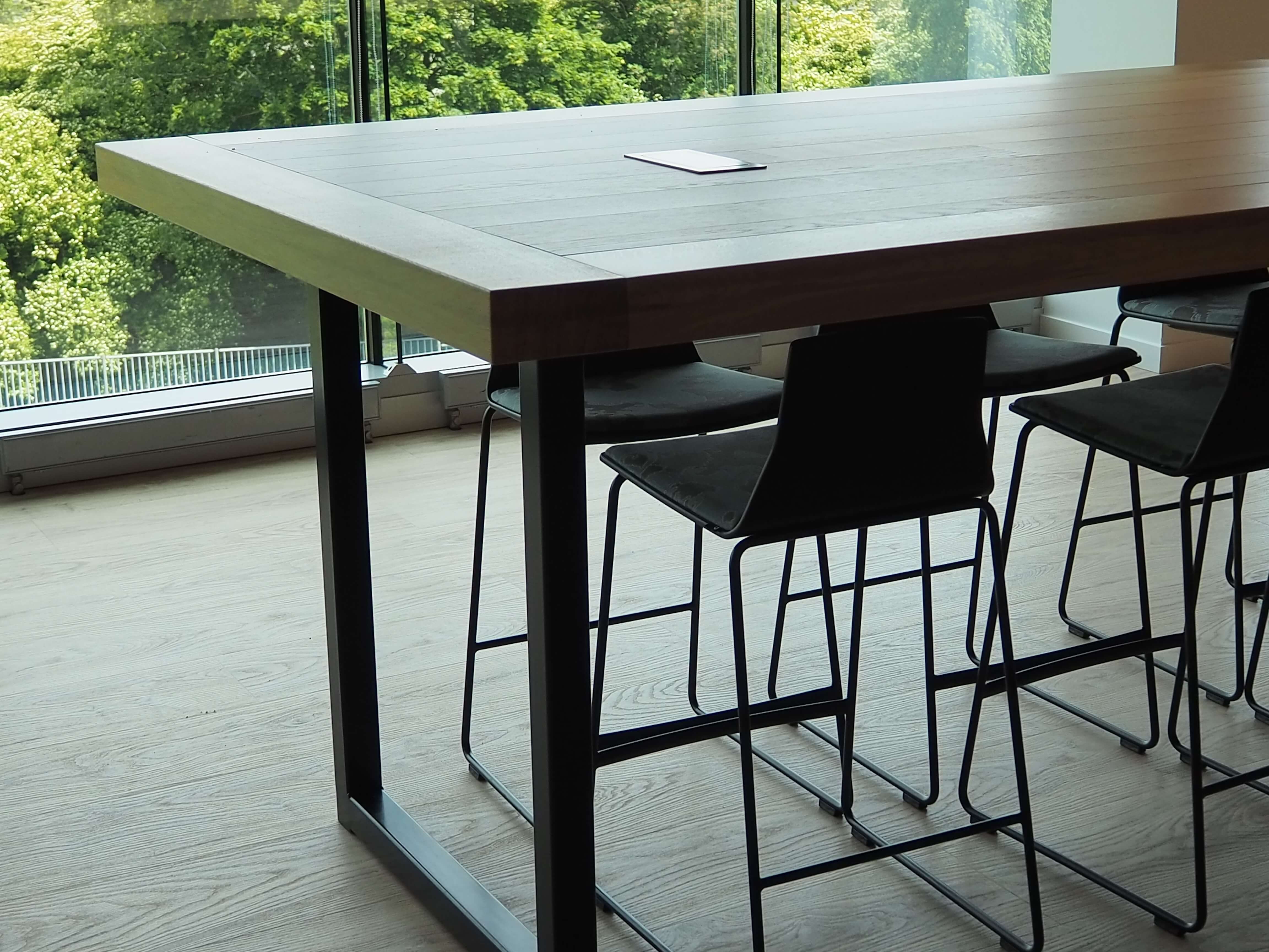 Meubles d'accent Projet Coca-Cola Table de ferme, une combinaison d'acier laqué, d'un cadre robuste en chêne massif et d'étagères.