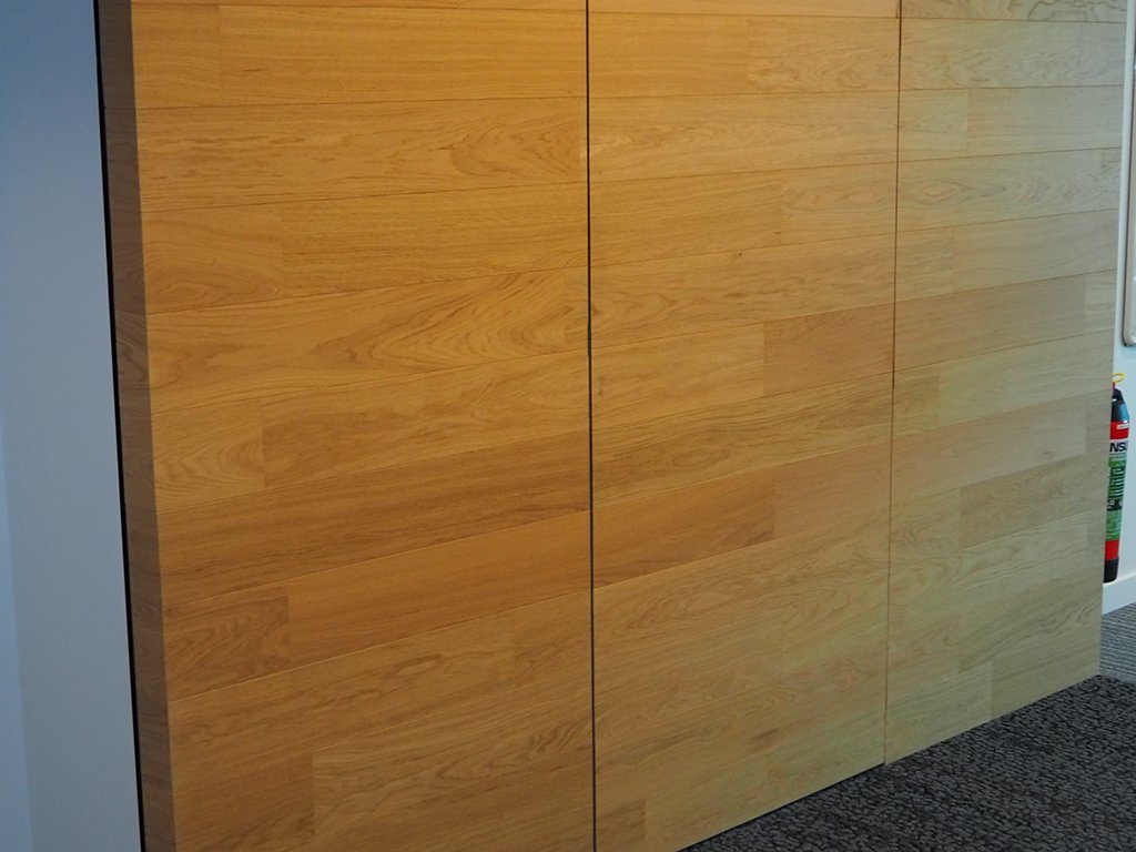 Portes Projet Coca Cola, Anderlecht Une porte dissimulée sans joint dans un revêtement mural en bois.