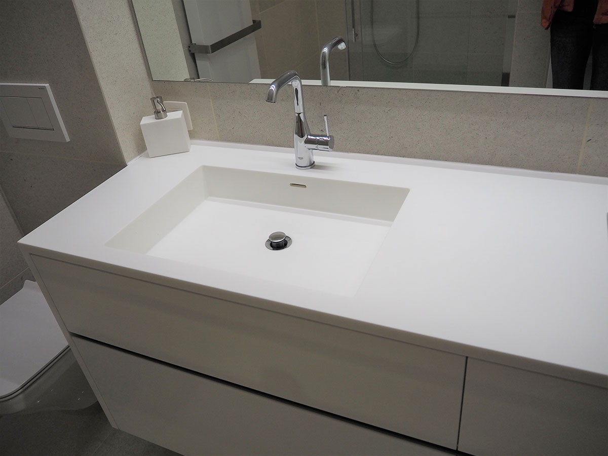 Salle de bains Projet Zaventem Meuble sur mesure sans poignée, avec tiroirs et tablette en solid surface (staron).