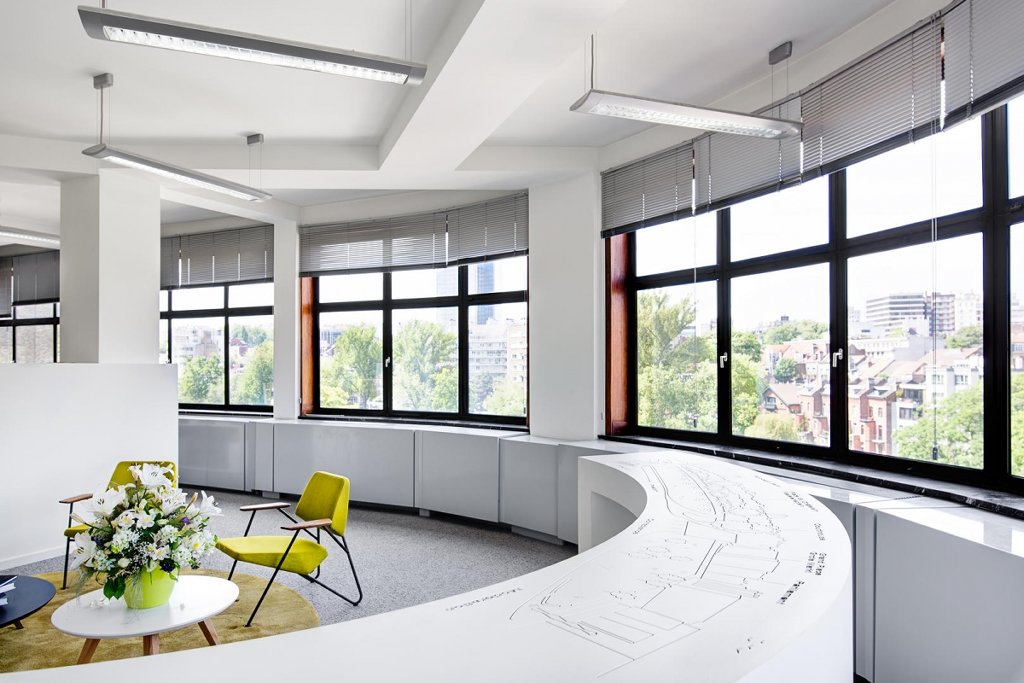 Bureau d'accueil en matériau de solid surface. Collage de la solid surface sur MDF noir dans la masse, permettant une belle gravure de la vue sur la Place Flagey.