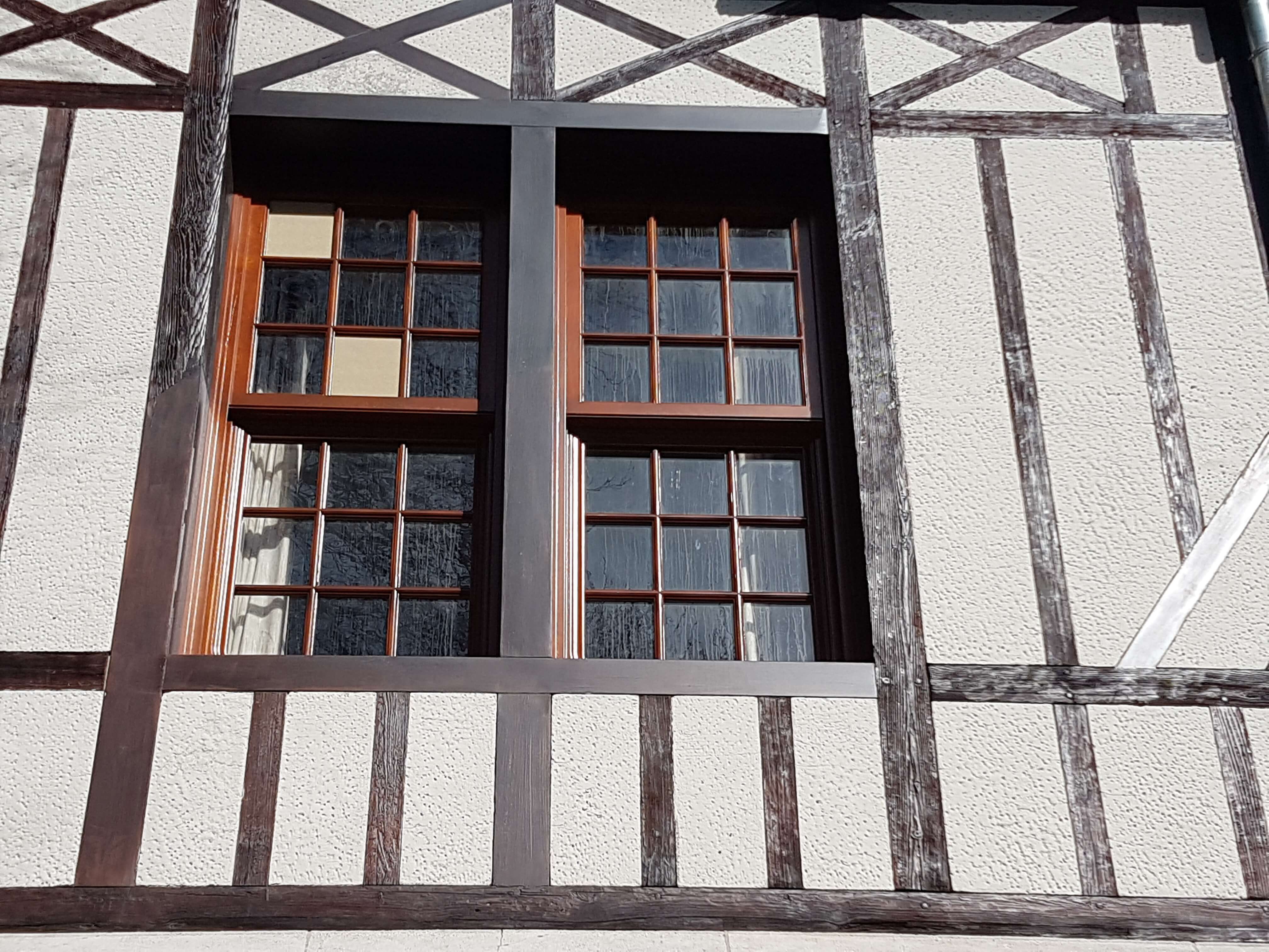 Het guillotineraam: passie voor hout en opgebouwde vakkennis. Deze ramen, harmonieus passend in een vakwerkgevel, werden herwerkt, rekening houdend met elk detail zoals het vroeger werd gemaakt.
