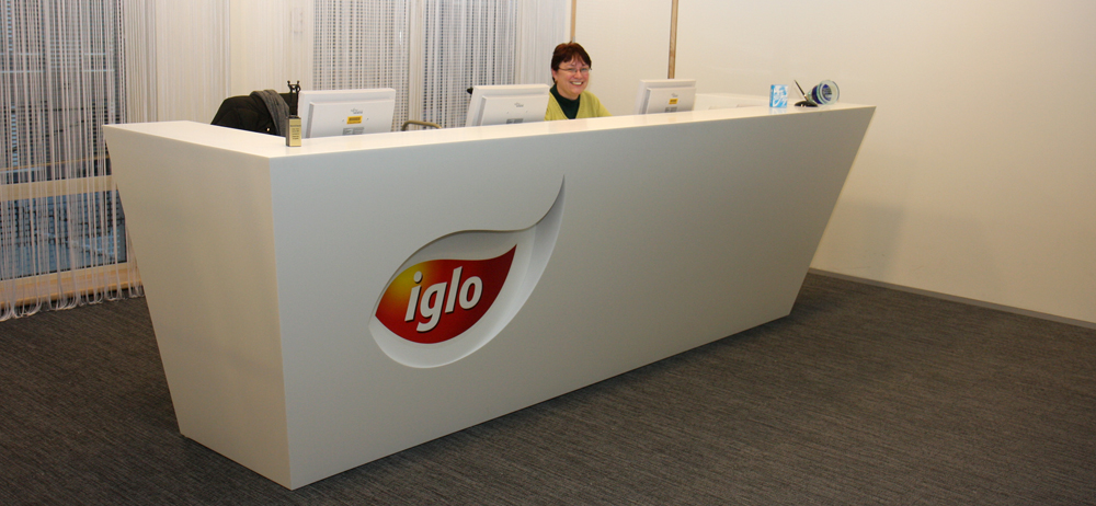 Solid surface Project Iglo: ontvangstdesk Ontvangstdesk in solid surface met als grote uitdaging de verwerking van de ‘Iglo vis’.