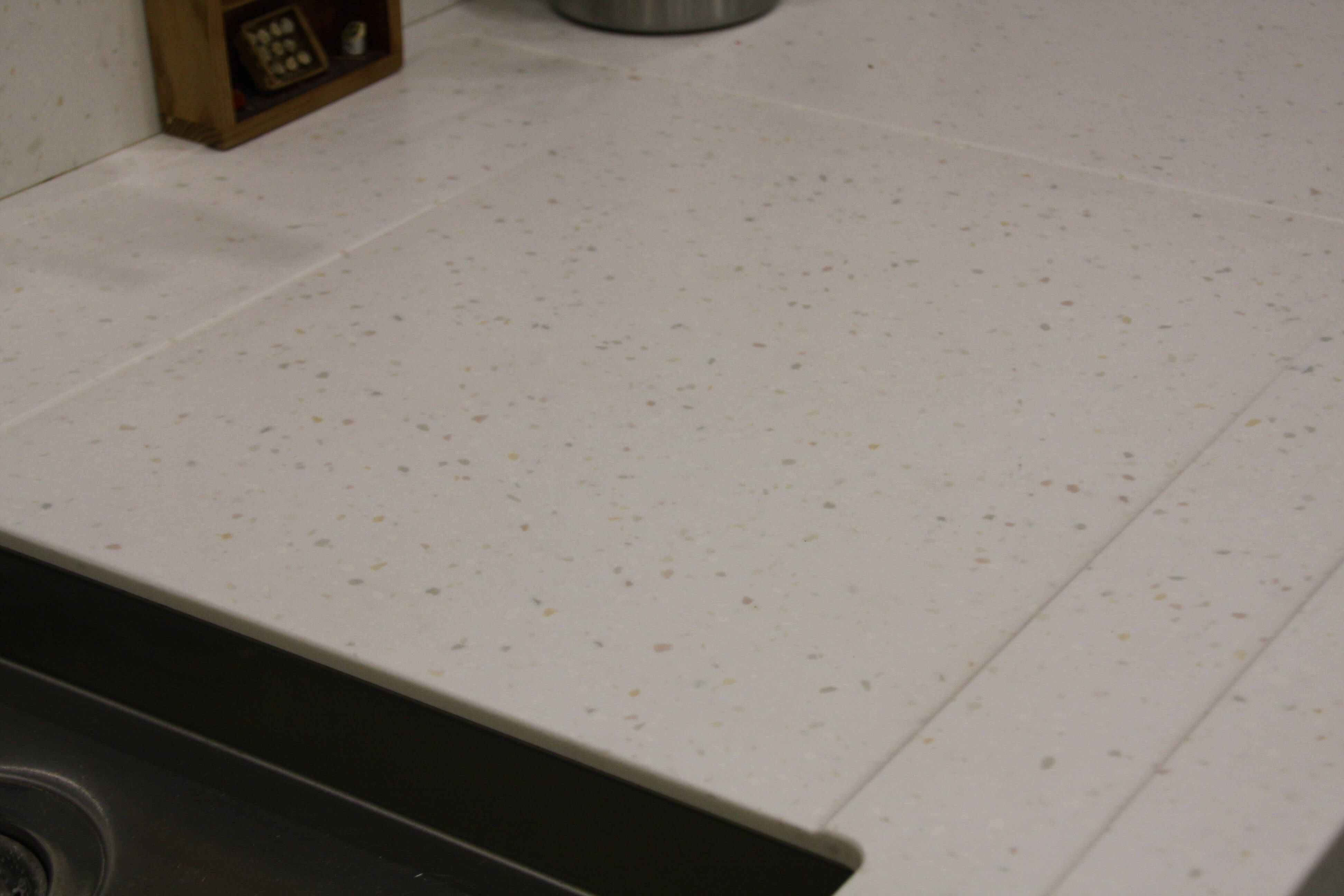 Solid surface Project Tubize: granietimitatie Traditioneel mooi: granietimitatie met verdiept uitgefreesd verlek.