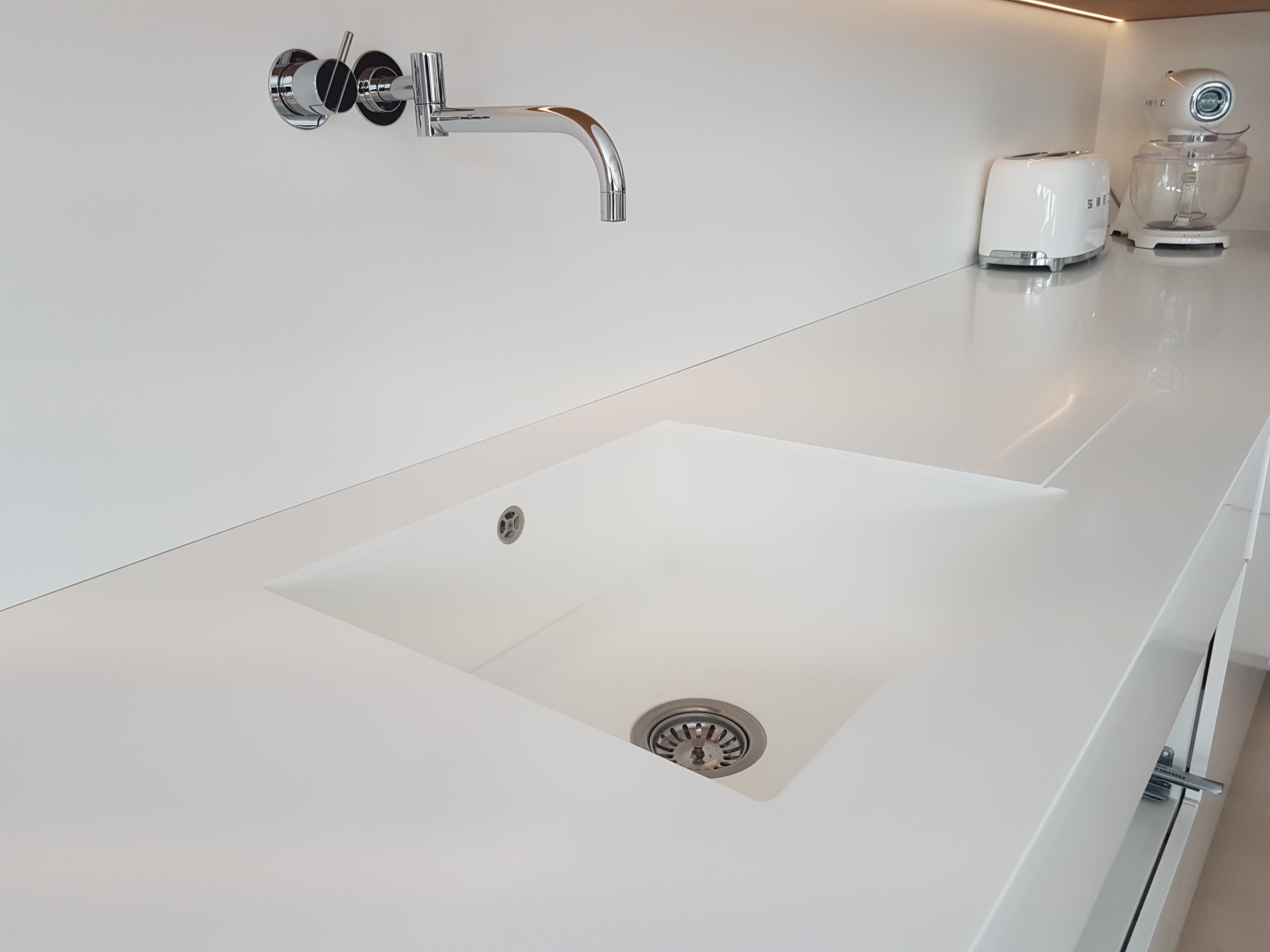 Solid surface Project Wolvertem: discrete verlekverwerking Werkblad en spatwand in witte solid surface met heel discrete verlekverwerking.